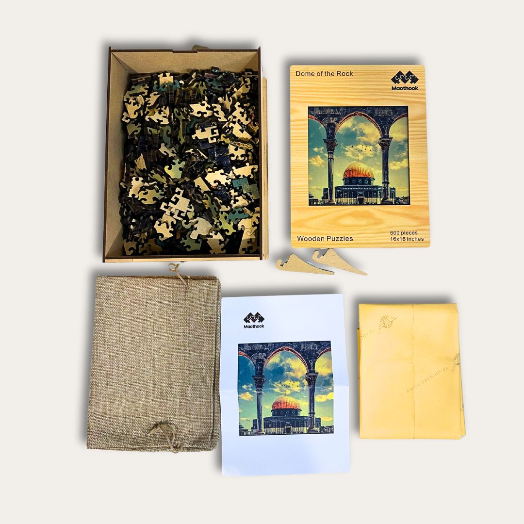 Discover this premium wooden jigsaw puzzle featuring the iconic Dome of the Rock, one of Islam's most sacred architectural treasures. Choose between two dimensions—13x13 or 16x16 pieces—to match your preferred difficulty level. Precision-cut wooden pieces deliver sharp edges and reliable fit, allowing you to reconstruct this magnificent Jerusalem landmark with accuracy. The finished puzzle showcases the monument's distinctive golden dome and ornate Islamic patterns in striking detail, making it both a rewarding intellectual challenge and an impressive display piece for your home or collection.