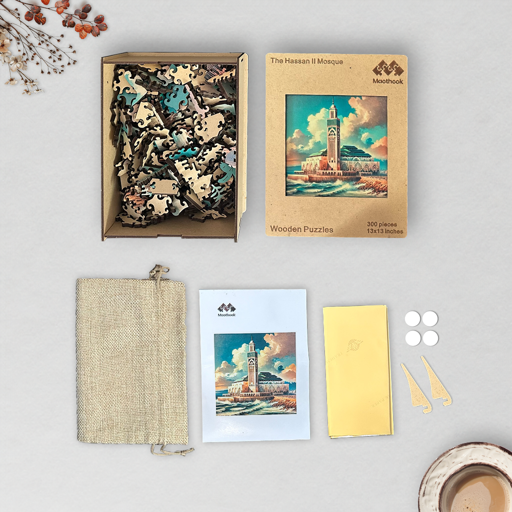 Celebrate the grandeur of Moroccan architecture with the Hassan II Mosque Puzzle. This 300-piece puzzle captures the stunning minaret and intricate detailing of one of the world’s tallest mosques, located in Casablanca. Known for its fusion of traditional Islamic motifs and modern engineering, this puzzle is a perfect blend of challenge and beauty.